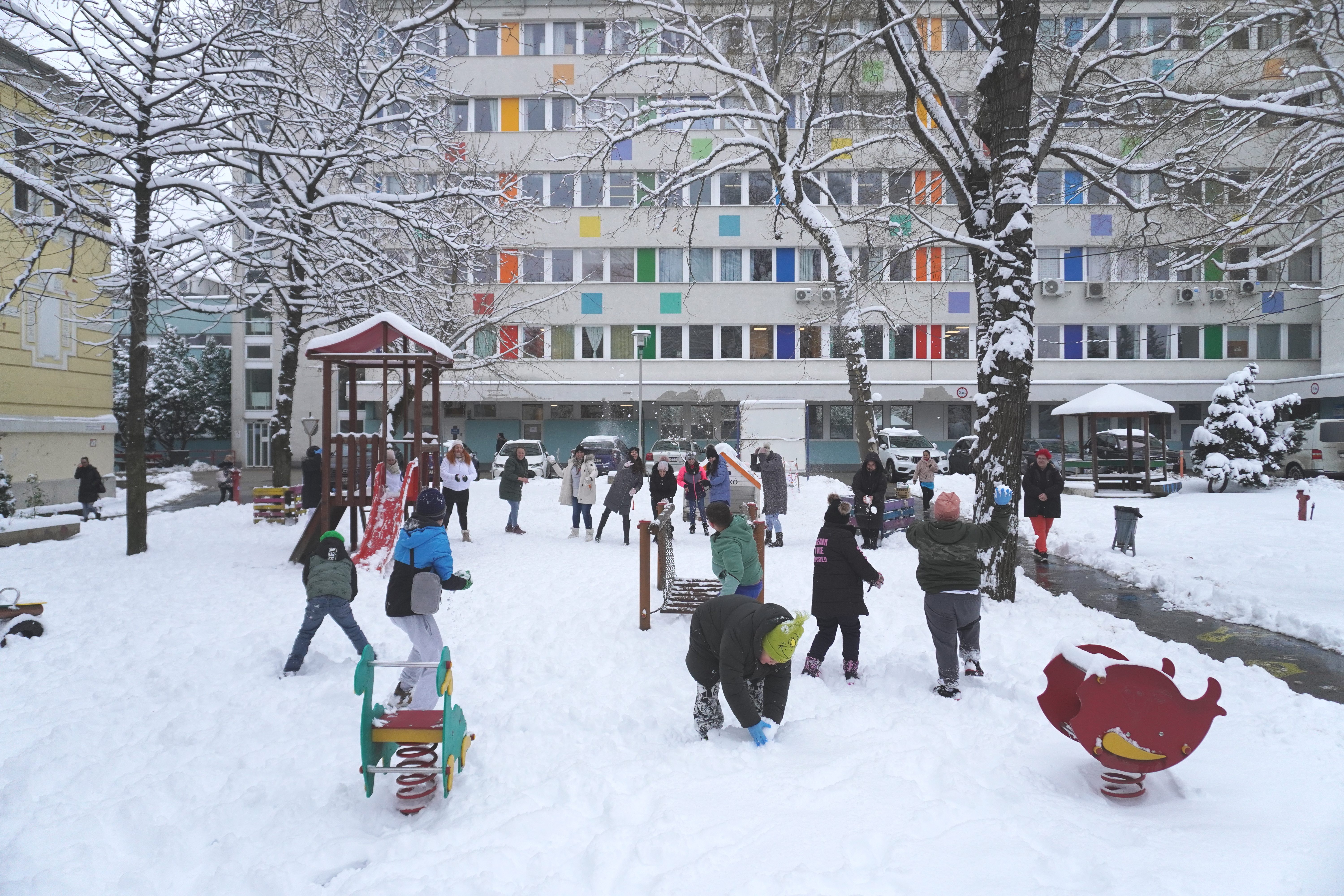 A Heim Pál gyermekkórház kis páciensei is nagy lelkesedéssel vetették bele magukat egy kiadós hócsatába, hóemberépítésbe és hóangyalkázásba az intézmény udvarán.